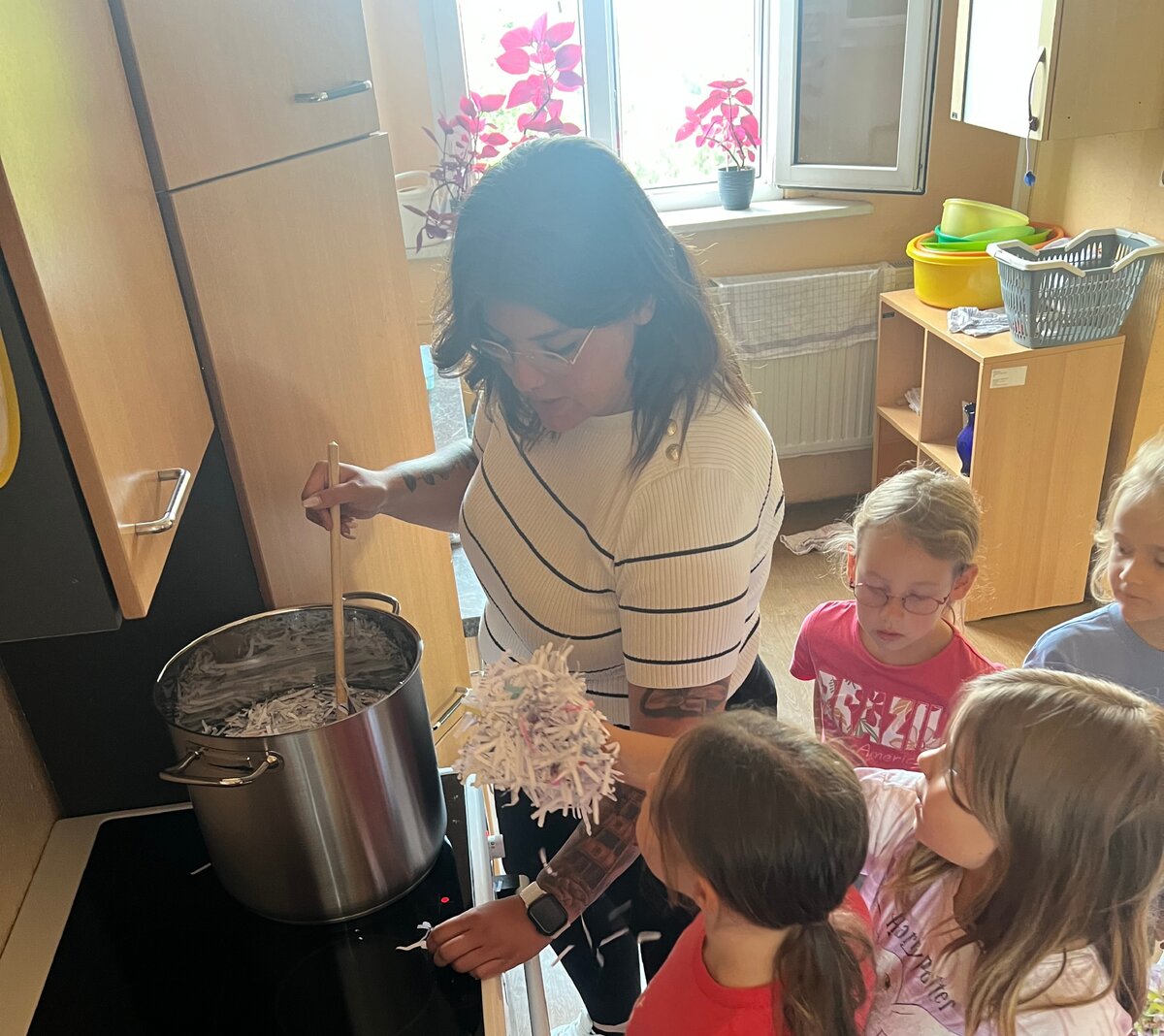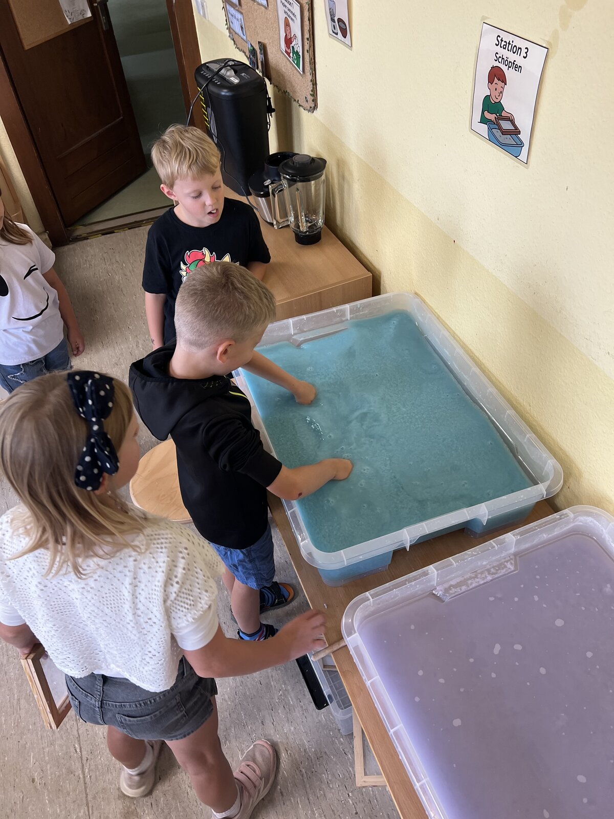 Dabei lernten die Kinder nicht nur, wie Papier entsteht, sondern auch, welche Auswirkungen die Papierproduktion auf Umwelt, Ressourcen und Klima hat. Mit viel Eifer und Neugier machten sie sich ans Werk: Papier wurde zerkleinert, eingeweicht, verarbeitet und anschließend mit Schöpfrahmen zu neuen Blättern verarbeitet. Dabei kamen auch Regenwasser und recycelte Materialien zum Einsatz.