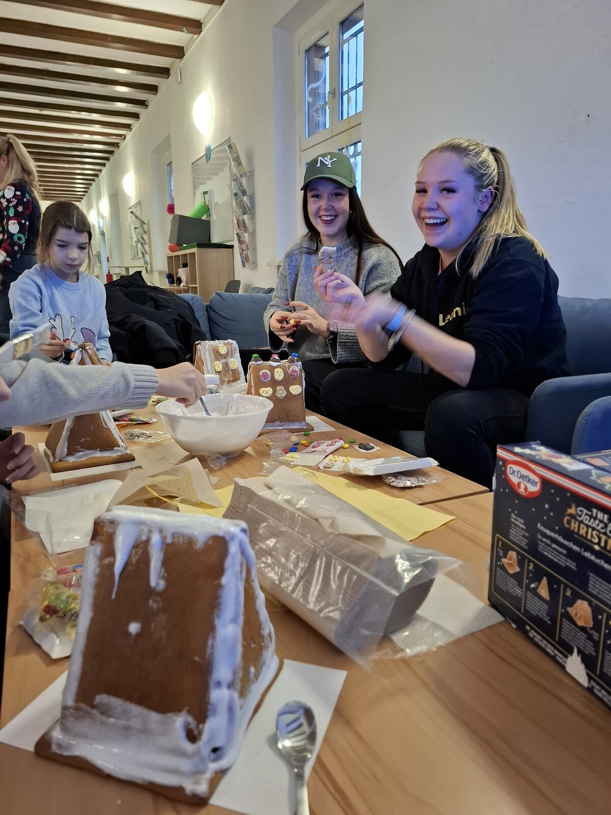 Ein Highlight war das Verzieren von Lebkuchenhäusern. Dabei erhielten wir Unterstützung vom Jugendbeirat. Die Häuser wurden gemeinsam zusammengebaut und anschließend nach eigener Fantasie bunt verziert. Es sind viele kreative und liebevoll gestaltete Häuser entstanden.