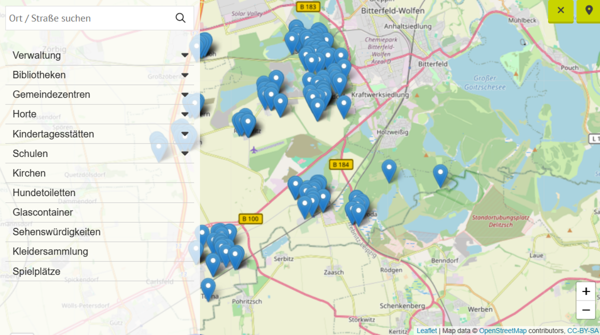 Wussten Sie schon? Auf unserer Website finden Sie eine digitale Karte der Stadt Sandersdorf-Brehna, die viele nützliche Standorte im Stadtgebiet übersichtlich darstellt. Ob Spielplätze, Hundetoiletten, Glascontainer, Kleidercontainer oder andere wichtige Punkte – mit einem Klick auf die jeweilige Kategorie erscheinen alle Standorte direkt auf der Karte. Und mit einem weiteren Klick lassen sie sich wieder ausblenden. So einfach funktioniert’s!