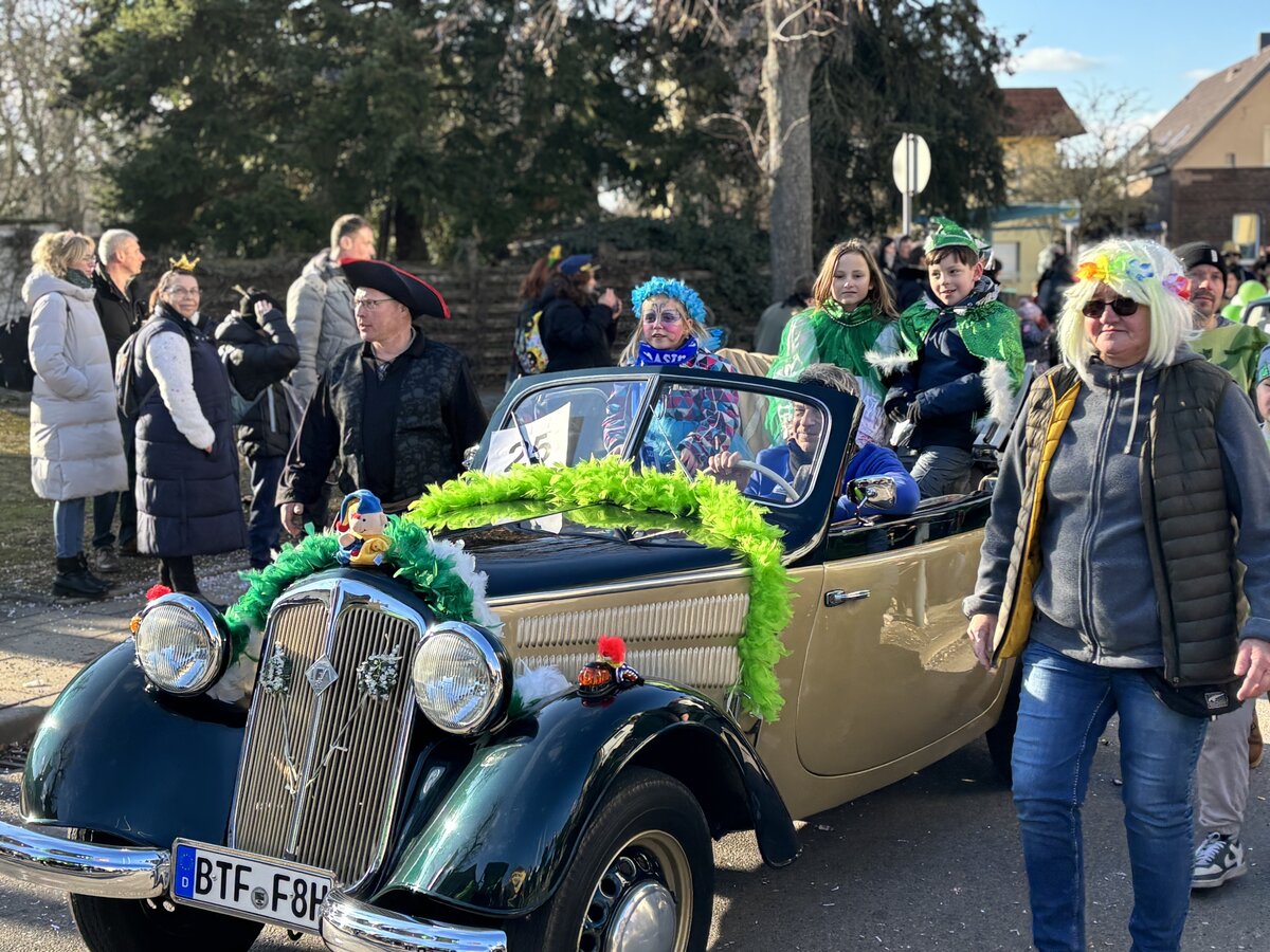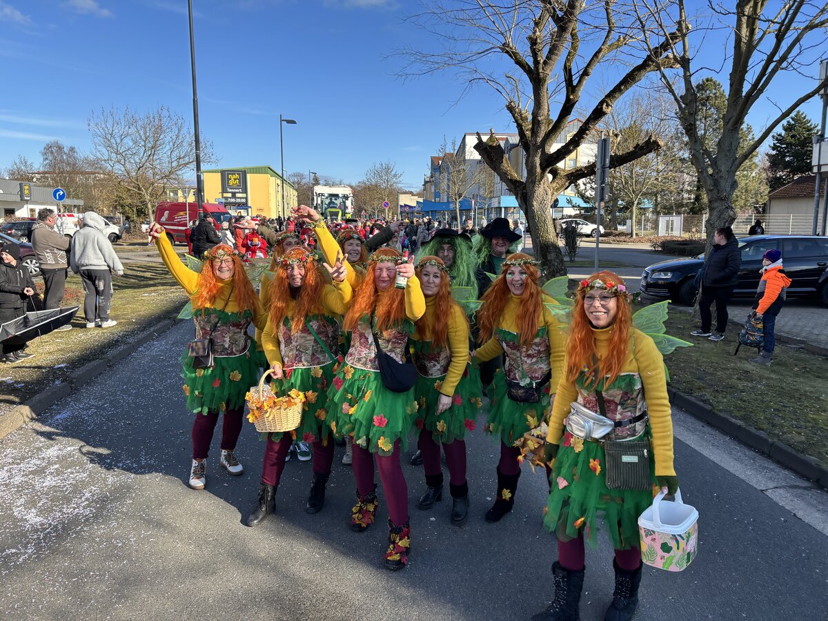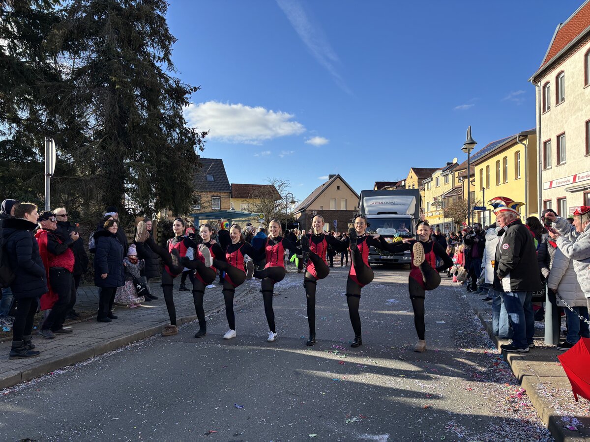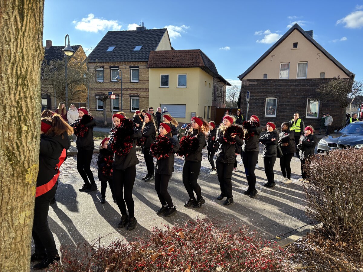 Mit 25 bunt geschmückten Wagen zog der farbenfrohe Festzug vom Sportzentrum über den Kreisel – wo Heike und Hubi erneut mit einer mitreißenden Moderation für Stimmung sorgten – weiter über die Straße der Neuen Zeit bis hin zum Rathaus. Dort präsentierten die Karnevalisten vor den Augen von Bürgermeisterin Steffi Syska und Ortsbürgermeister Andy Grabner ihre mitreißenden Showtänze und grüßten das närrische Publikum.