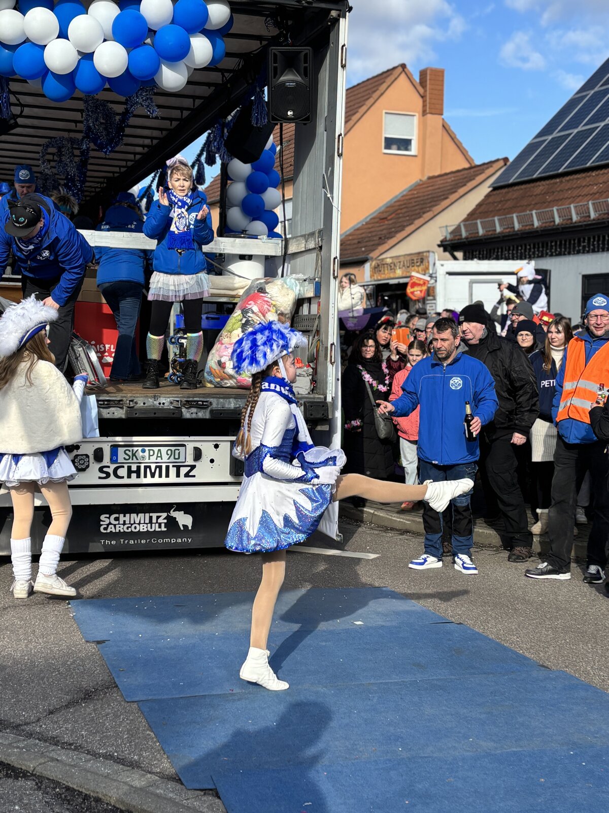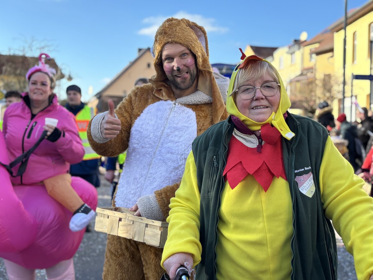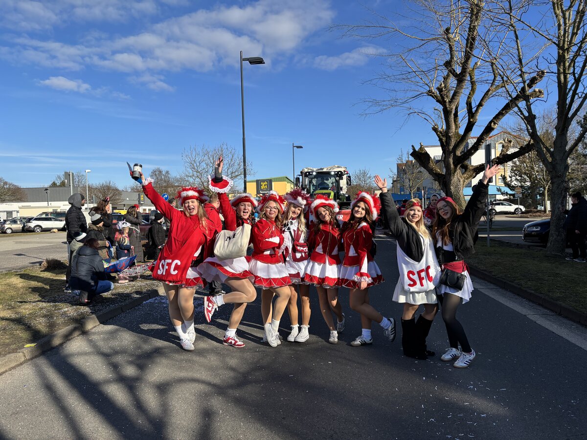 Mit 25 bunt geschmückten Wagen zog der farbenfrohe Festzug vom Sportzentrum über den Kreisel – wo Heike und Hubi erneut mit einer mitreißenden Moderation für Stimmung sorgten – weiter über die Straße der Neuen Zeit bis hin zum Rathaus. Dort präsentierten die Karnevalisten vor den Augen von Bürgermeisterin Steffi Syska und Ortsbürgermeister Andy Grabner ihre mitreißenden Showtänze und grüßten das närrische Publikum.