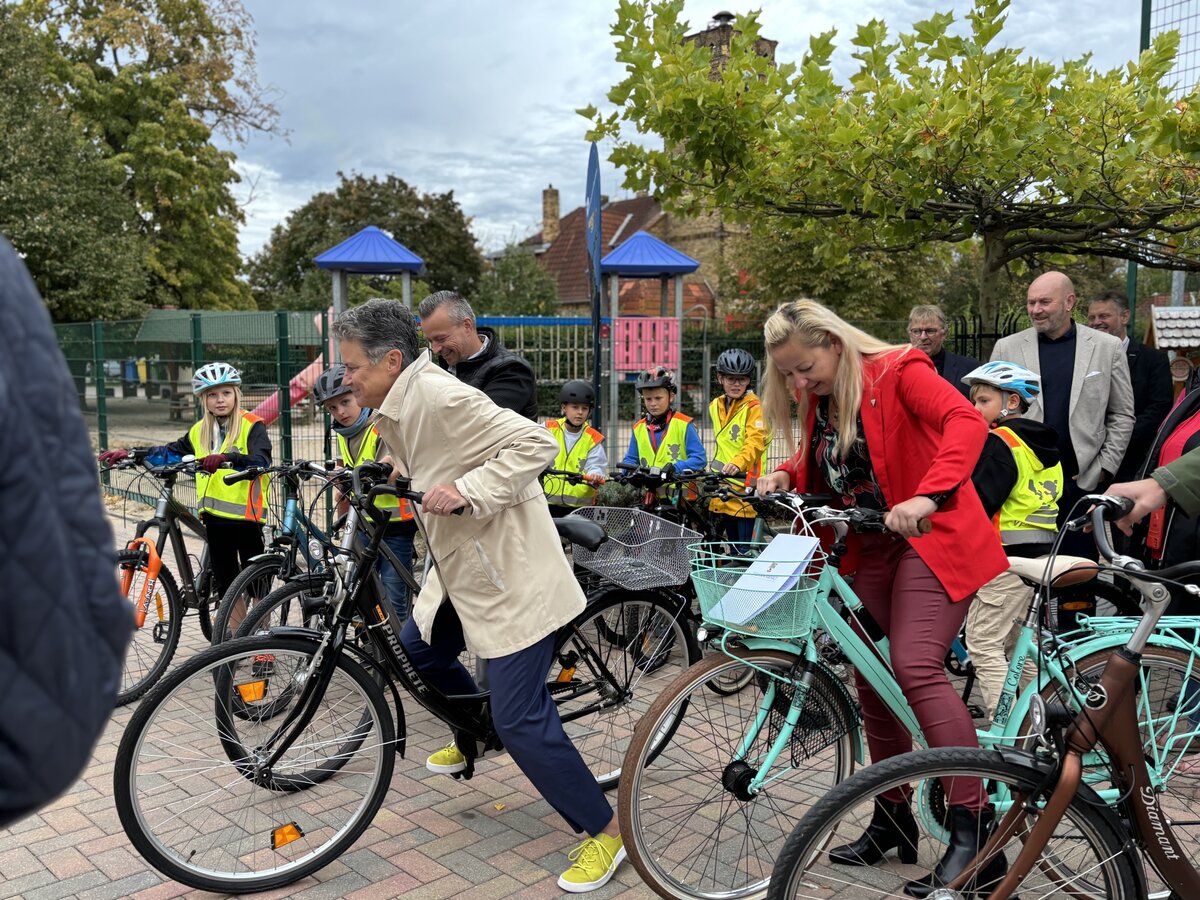 Bürgermeisterin Steffi Syska, Ministerin Lydia Hüskens, Landrat Andy Grabner und der stellvertretende Oberbürgermeister Stefan Herrmann ließen sich nicht lange bitten und stiegen ebenfalls auf die Fahrräder. Gemeinsam führten sie die zuvor von den Kindern demonstrierte „Abklatsch-Übung“ aus.