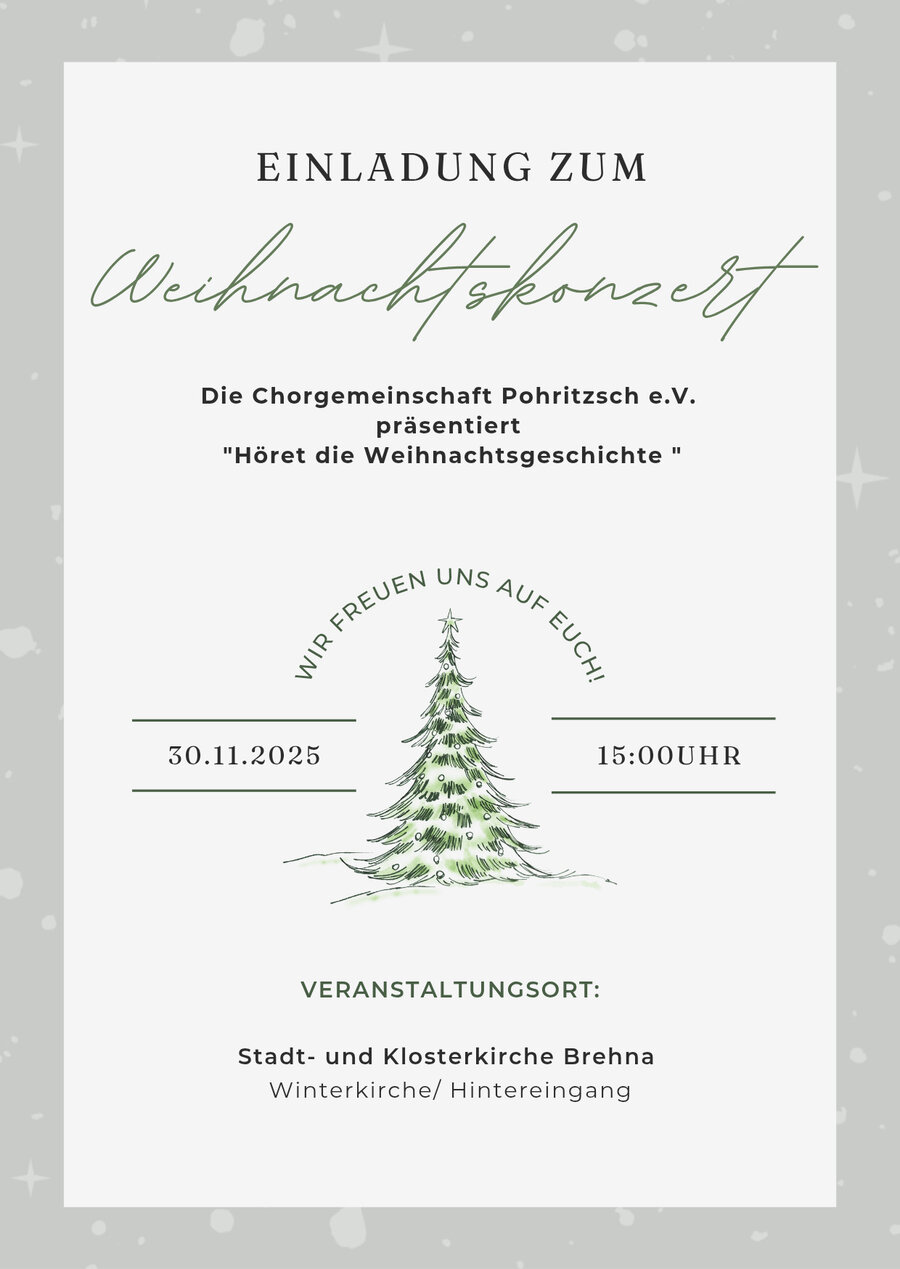 Alle Jahre wieder und doch jedes Jahr ganz neu! Eingehüllt in alt vertraute Weihnachtslieder zum Mitsummen wird die Weihnachtsgeschichte, vertont von Lorenz Maierhofer, erklingen. Die Chorgemeinschaft Pohritzsch e.V. und ein Streichensemble nehmen euch mit auf die Reise nach Bethlehem über Stock und Stein bis hin an die Krippe, in der das Jesuskind friedlich schläft.