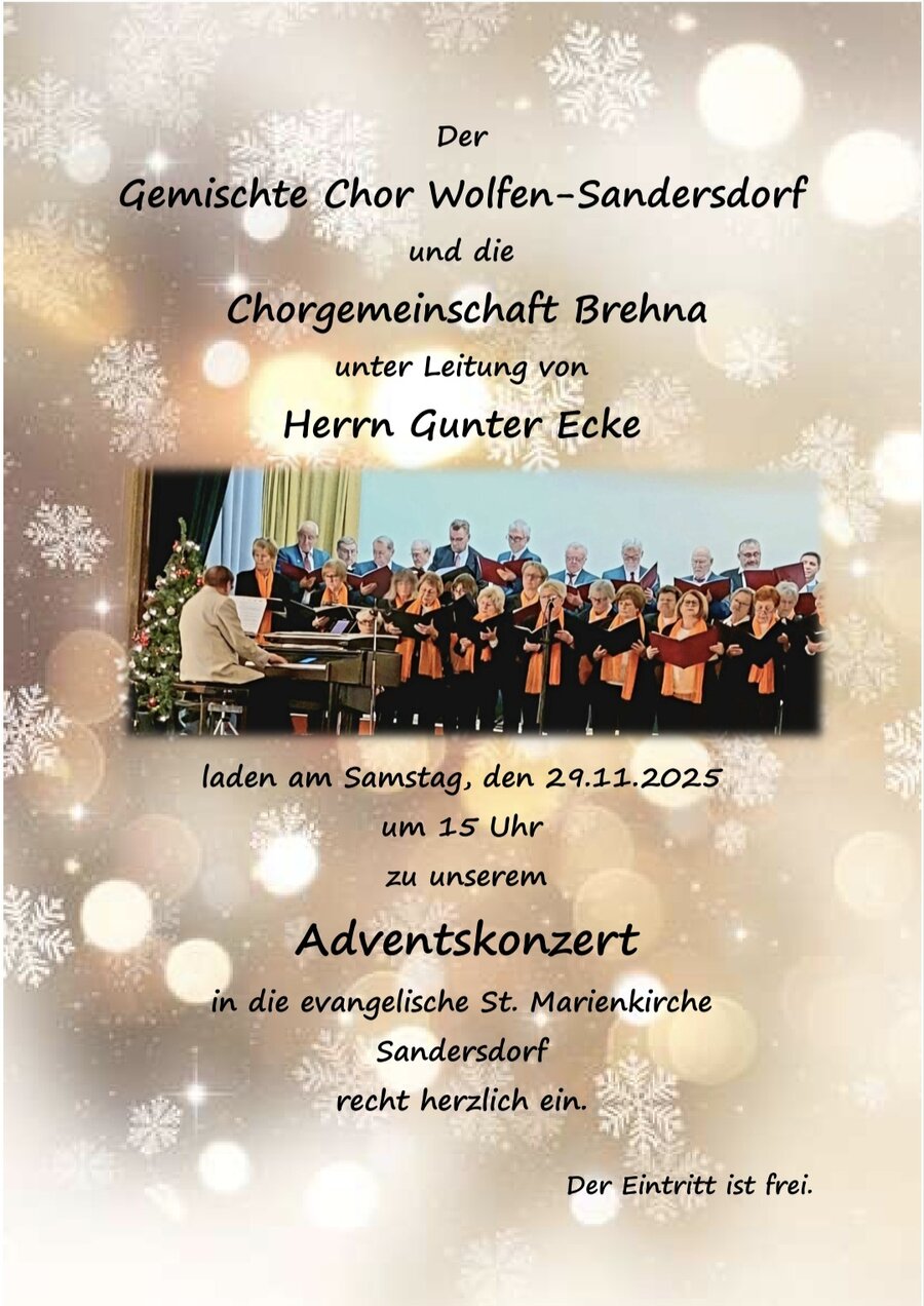 Der Gemischte Chor Wolfen-Sandersdorf und die Chorgemeinschaft Brehna laden am Samstag vor dem 1. Advent zu einem gemeinsamen Konzert in die evangelische Kirche Sandersdorf ein.