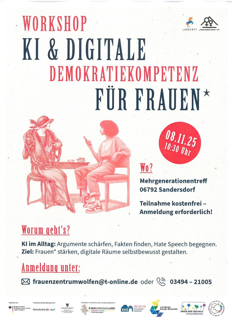 Das Frauenzentrum Wolfen vom Verein Frauen helfen Frauen lädt in Kooperation mit der Gleichstellungsbeauftragten des Landkreises Anhalt-Bitterfeld und dem Mehrgenerationentreff Sandersdorf zu dem innovativen Workshop Stärkung digitaler Demokratiekompetenzen Empowerment-Workshop für Frauen