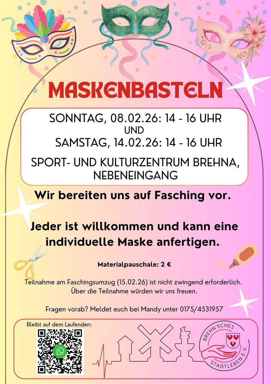 Wir basteln Masken für Fasching. Jeder ist willkommen und kann seine eigene Maske gestalten. Achtung: 2 Termine: 08.02. und 14.02.26