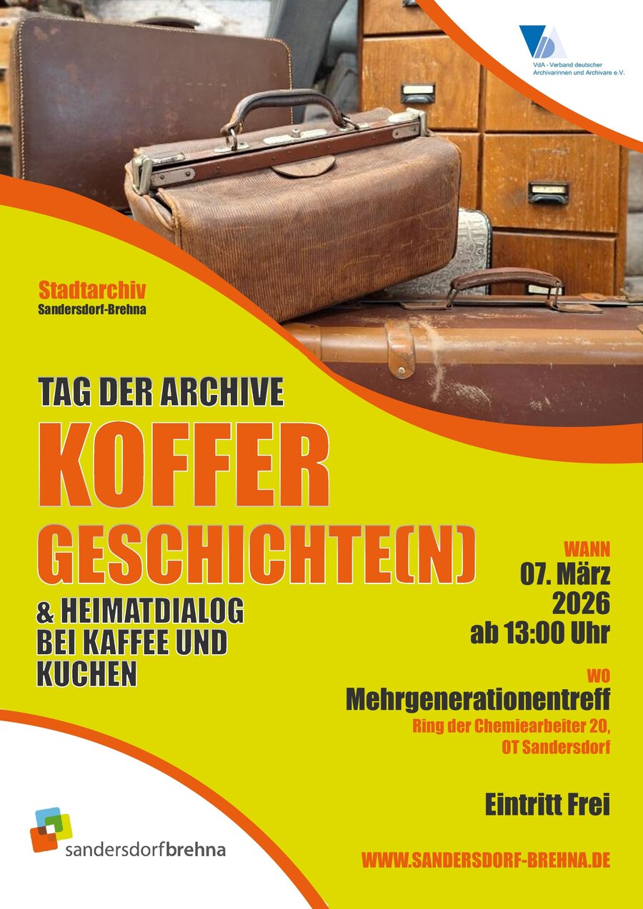 Am 7. März 2026 lädt das Stadtarchiv Sandersdorf-Brehna alle Interessierten ein, wieder mal einen Blick auf die Geschichte ihrer Stadt zu werfen. Zum diesjährigen bundesweiten Tag der Archive steht ein ganz besonderes Projekt im Mittelpunkt: Geschichte und Geschichten aus dem Koffer.