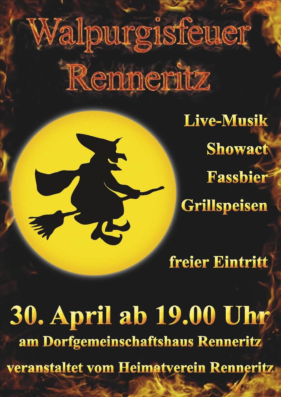Der Heimatverein Renneritz lädt auch in diesem Jahr wieder herzlich zur stimmungsvollen Walpurgisnacht am Mittwoch, den 30. April, rund um das Dorfgemeinschaftshaus Renneritz ein.