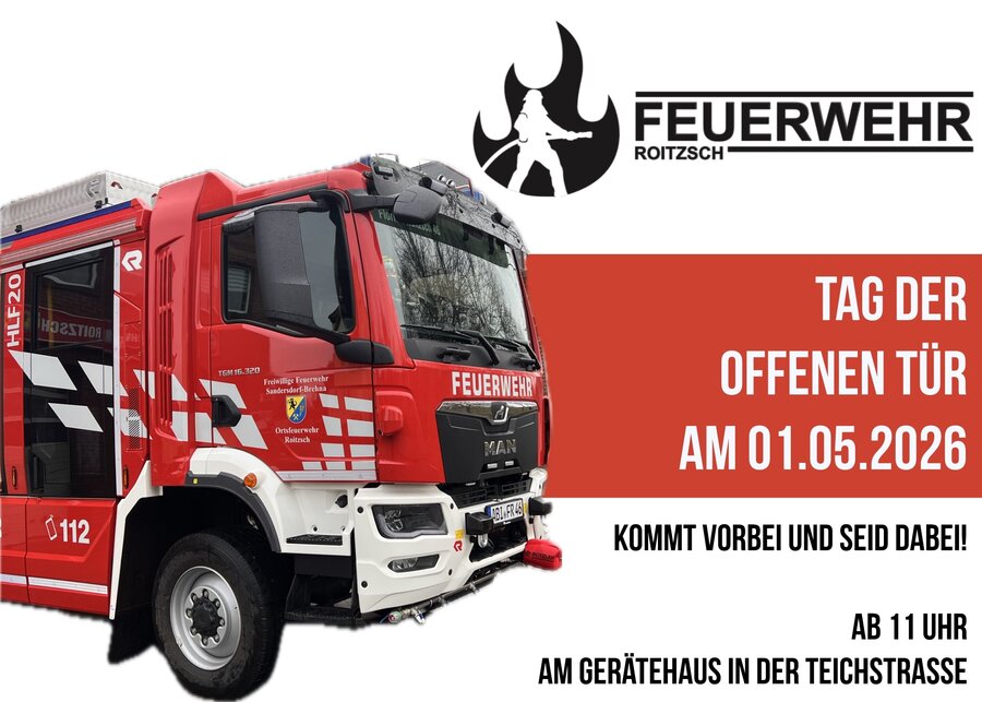 Sehr geehrte Einwohner der Stadt Sandersdorf- Brehna, die Ortsfeuerwehr Roitzsch lädt am 1.Mai 2026 ab 11:00 Uhr zum traditionellen Tag der offenen Tür ein.